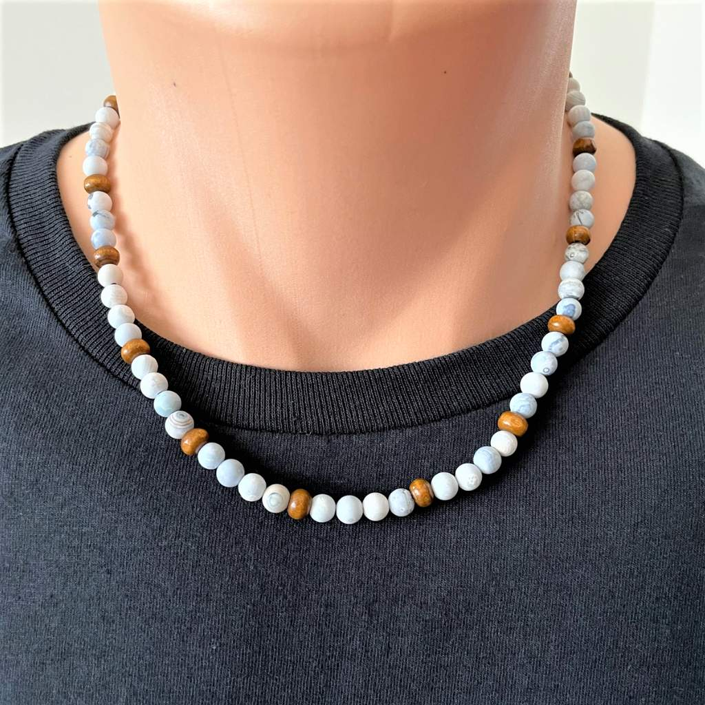 Blue and White Matte Agate and Wood Mens Beaded Necklace