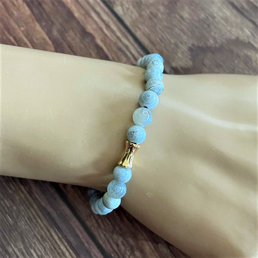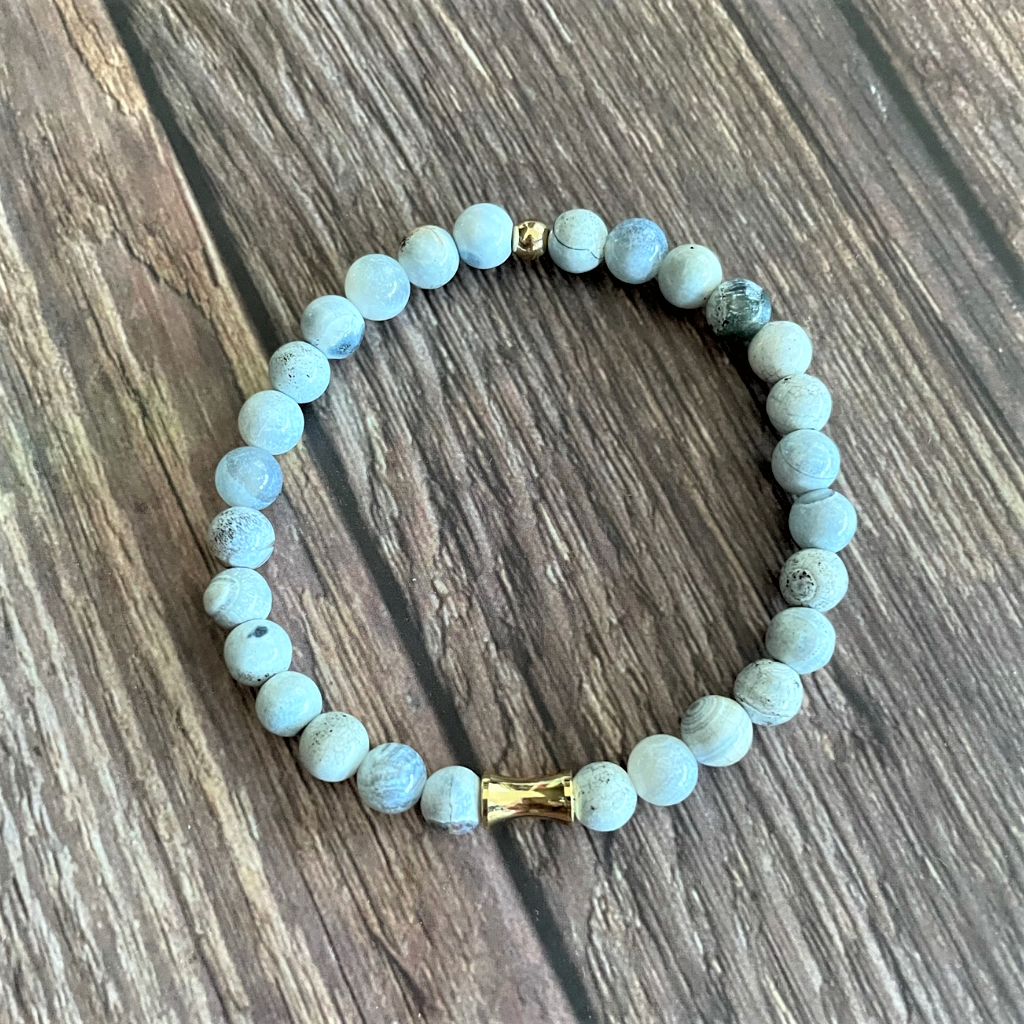 Blue and White Agate Beaded Bracelet with Gold Beads