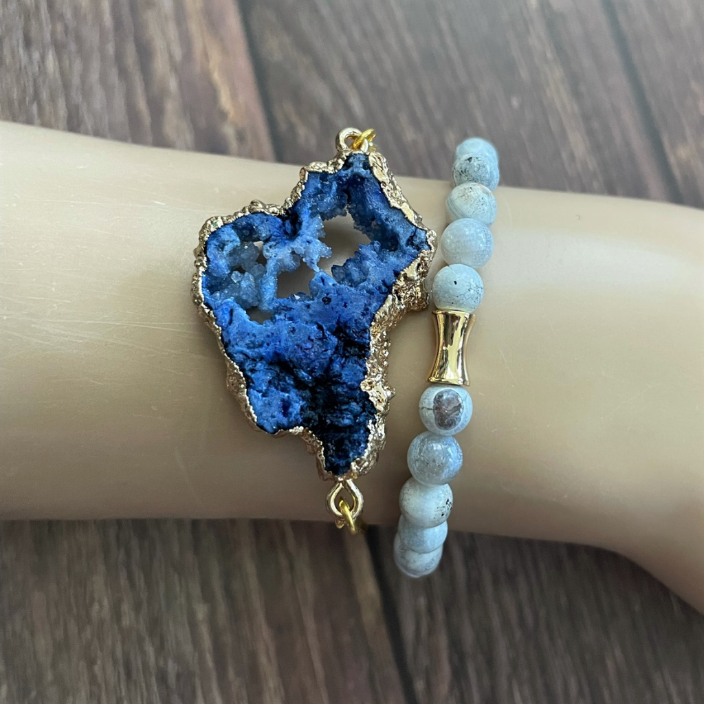 This charming bracelet features a fun mix of blue and white agate beads, each 6mm in size. A shiny gold hourglass bead takes center stage, adding a splash of sparkle. Easy to wear with its stretchy design, it’s perfect for adding a pop of color and cheer to any outfit!