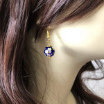 These elegant earrings showcase translucent navy blue glass beads, each delicately hand-painted with floral designs. Measuring 10mm, the beads are gracefully framed by gold caps at both ends and suspended from refined gold ear wires, offering a timeless and sophisticated accessory.