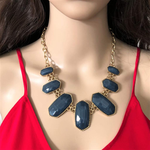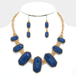 Elegant faceted blue stones are elegantly connected on a gold chain, featuring a graduated design with the largest stone positioned at the center. The necklace measures 18" with an additional 3" extension for adjustable length. Complementing the set are matching blue faceted dangle earrings, each measuring 2" in length.