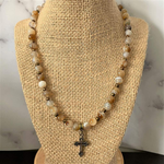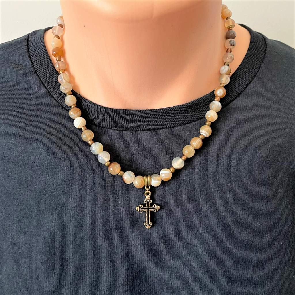 Brown Onyx Mens Beaded Necklace With Gold Cross