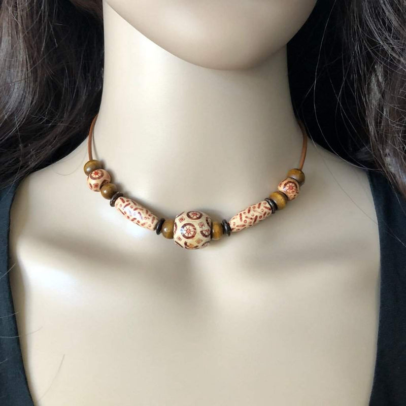 This boho-inspired choker features a brown leather cord adorned with an assortment of brown beads in different shapes. It highlights a prominent central bead, flanked by two smaller beads showcasing a wagon wheel design, complemented by solid brown and dark brown beads and confetti-style tubular wooden beads. The necklace measures 12 inches with an extension and secures with a lobster clasp.
