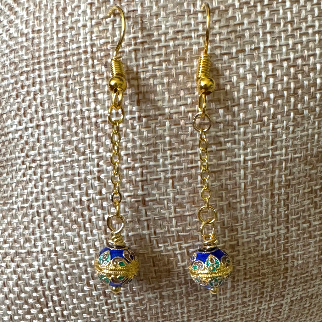 Cloisonné Cobalt, Green, Aubergine, and Gold Dangle Earrings