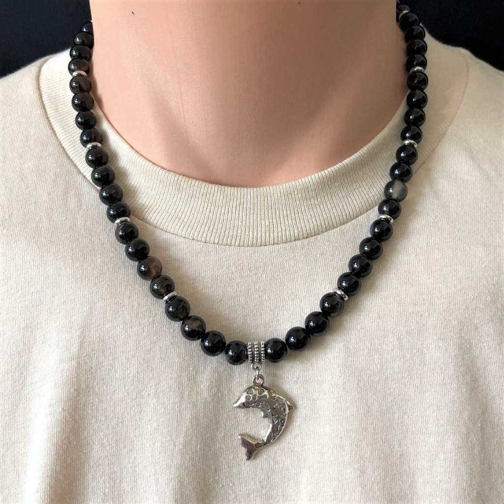 Dark Brown Agate and Silver Fish Mens Beaded Necklace
