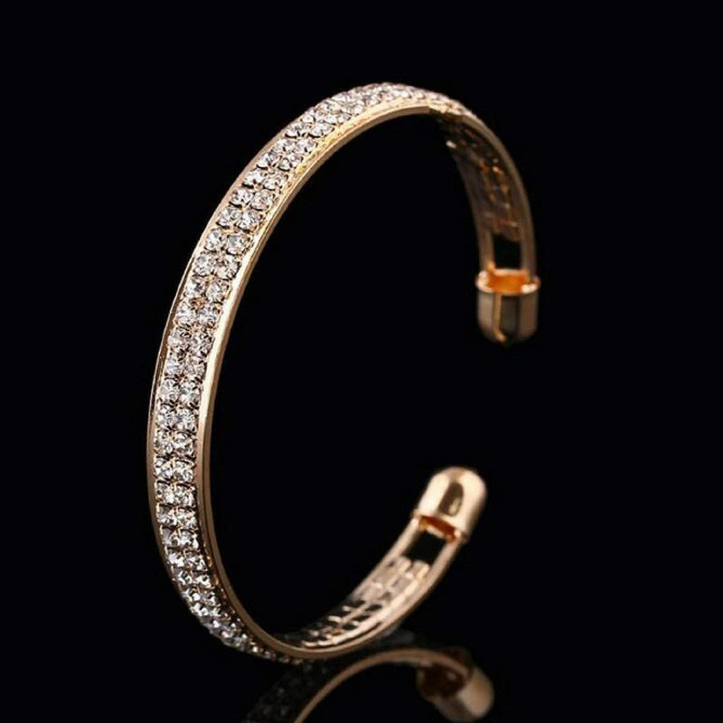 This gold cuff bracelet sparkles with two dazzling rows of crystals. It measures 2 1/2" in diameter and is a sleek 1/4" wide, perfect for adding a touch of fun shine to any outfit.