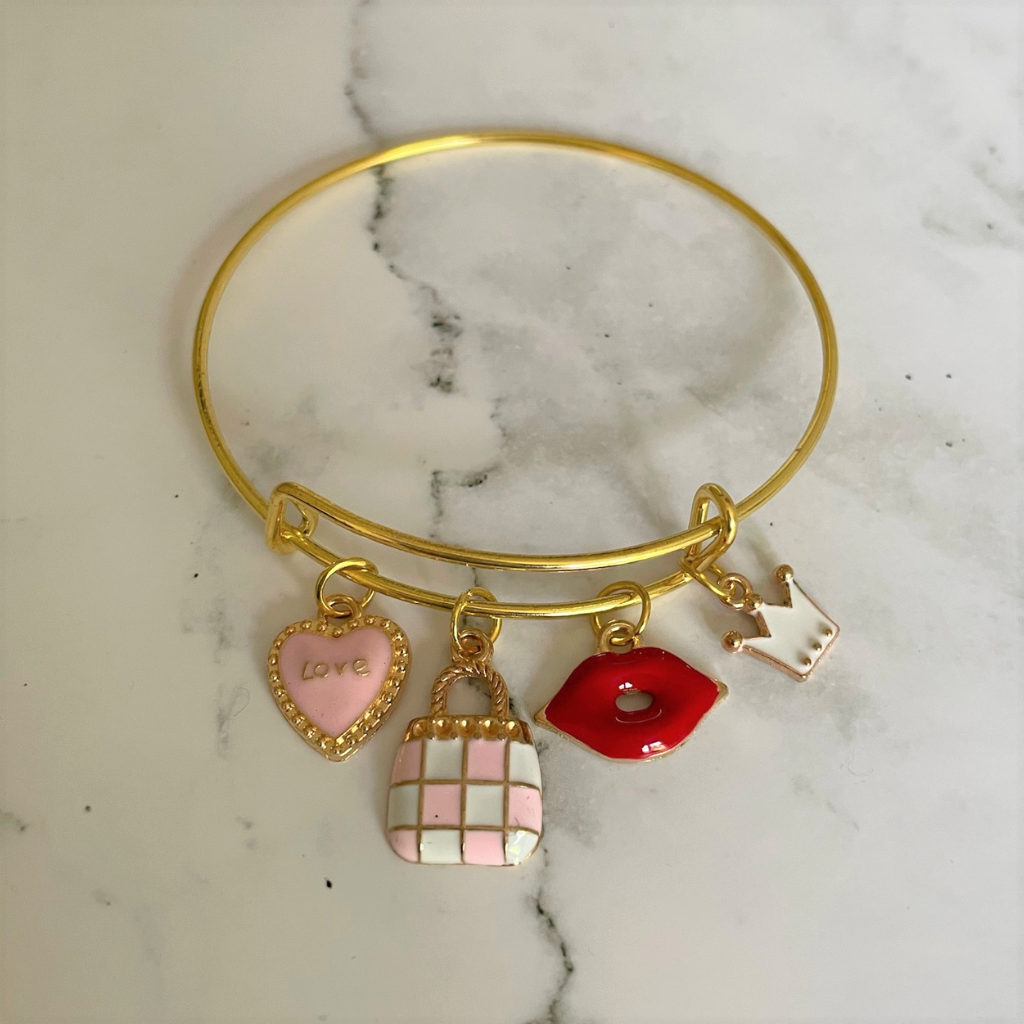 This adjustable gold bangle bracelet features vibrant enamel charms like a pink heart, a pink and white purse, red lips, and a white crown. Each charm is about 1/2" in size, making it a fun and stylish gift for the fashion lover in your life!