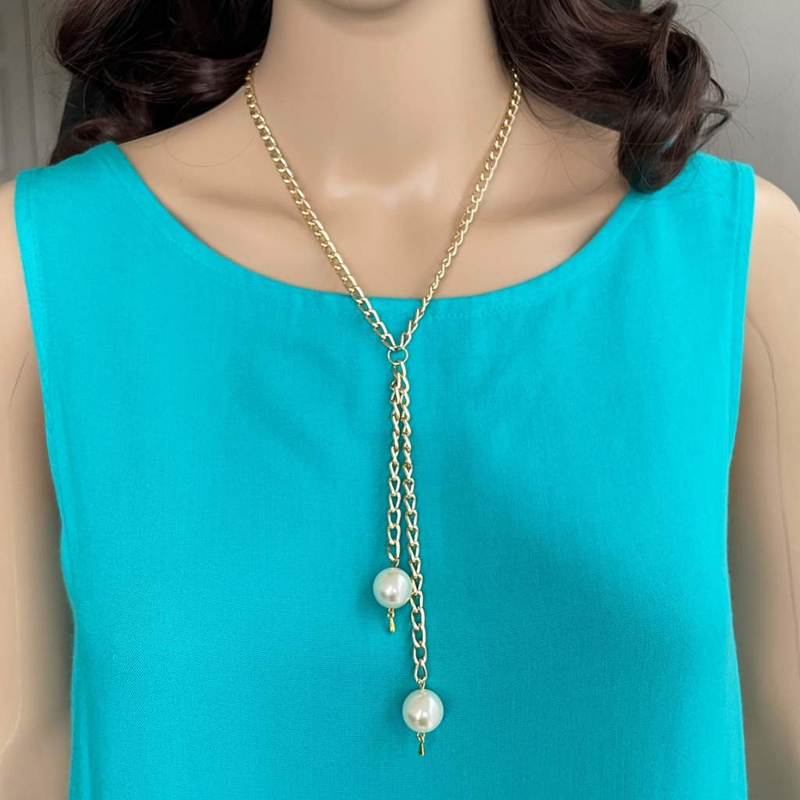 Make a statement with this bold gold chain necklace featuring two large faux pearls gracefully suspended from separate drop chains. Measuring 18 inches with an extension, the pearl accents extend 3 1/2 and 5 inches for added elegance. Finished with a secure lobster clasp, this piece effortlessly enhances any outfit.