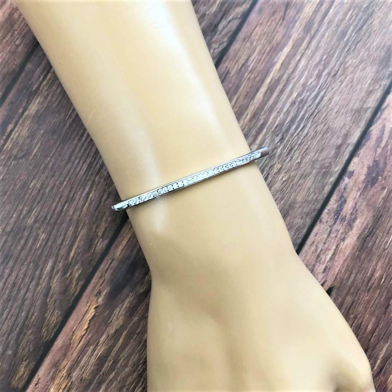 This elegant adjustable bracelet showcases a semi-circle bar adorned with a delicate row of Cubic Zirconia stones along its upper edge. The bar measures 2 1/4" in length and 1/8" in width, offering a refined and graceful accent for any ensemble.