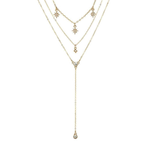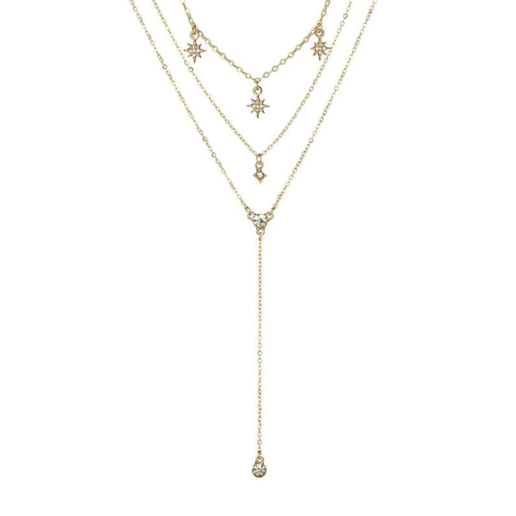 This necklace features three delicate gold chains adorned with gold and crystal starbursts. The shortest chain is 12" long with three starbursts, the middle chain measures 16" and highlights a central crystal, while the longest chain extends up to 22" with a 4" extension and a crystal drop at the end.