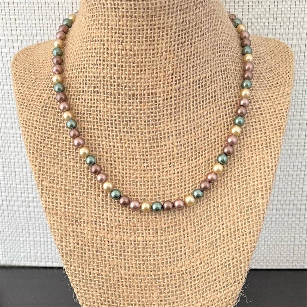 Shell Pearl beads artfully merge the delicate luster of pearls with the organic texture of shells, resulting in exquisitely shimmering beads. This necklace features 6mm beads in elegant shades of green, brown, bronze, and gold, finished with a refined gold lobster clasp.