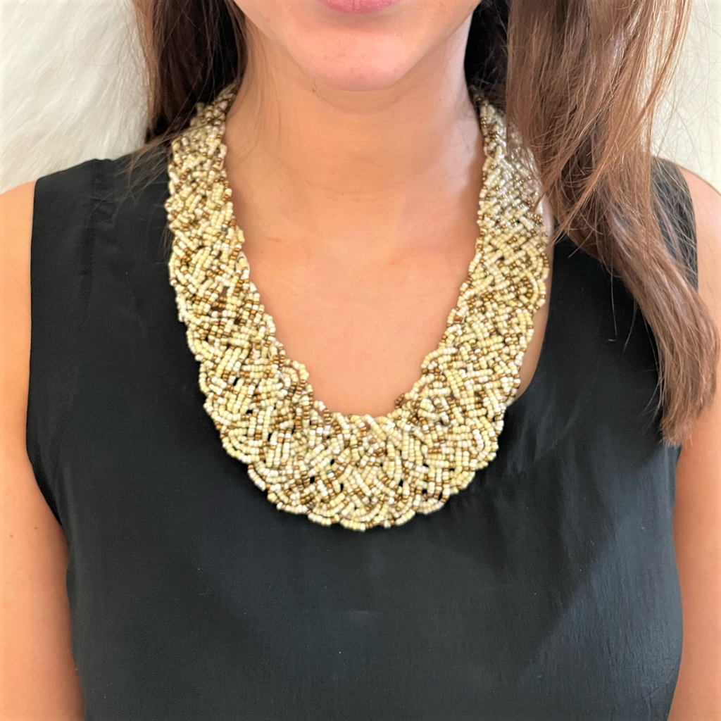 Ivory and Bronze Seed Beaded Collar Necklace and Earrings