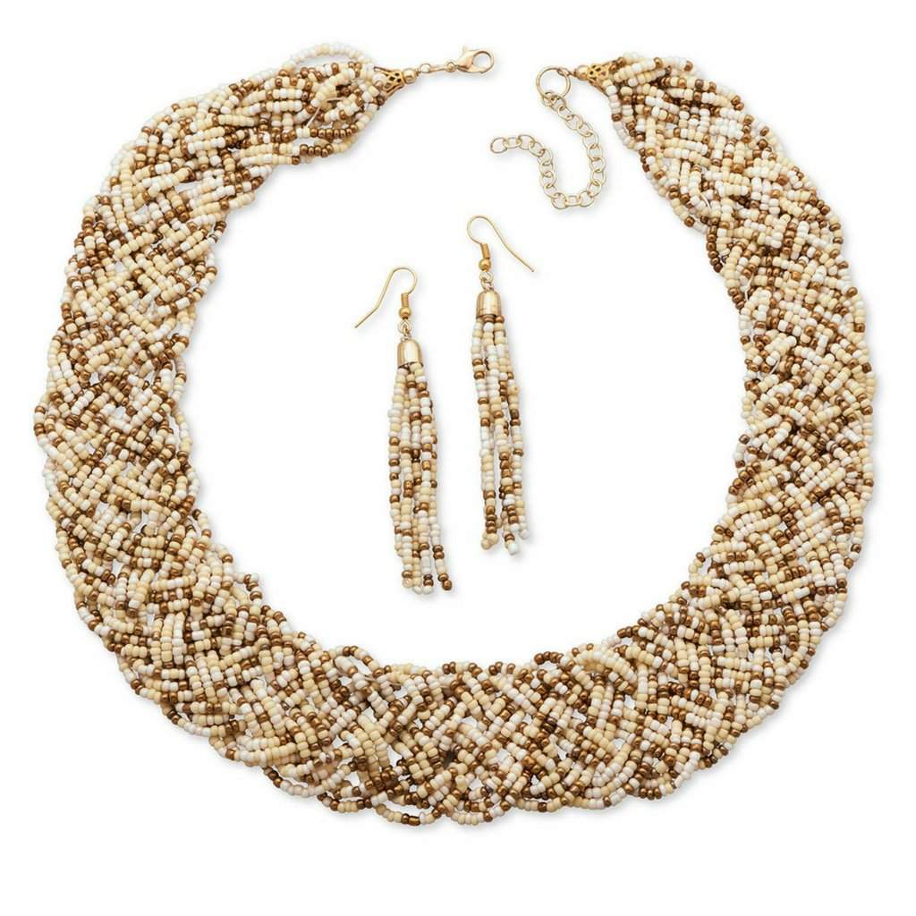 This necklace features ivory and bronze glass seed beads intricately woven into a braided collar that gradually widens from 3/4" to 1 1/2". Measuring 19" with an additional 3" extension, it secures with a lobster clasp for a comfortable fit. The set includes matching multistrand seed bead earrings that are 3 1/2" long, completing a coordinated and eye-catching look.