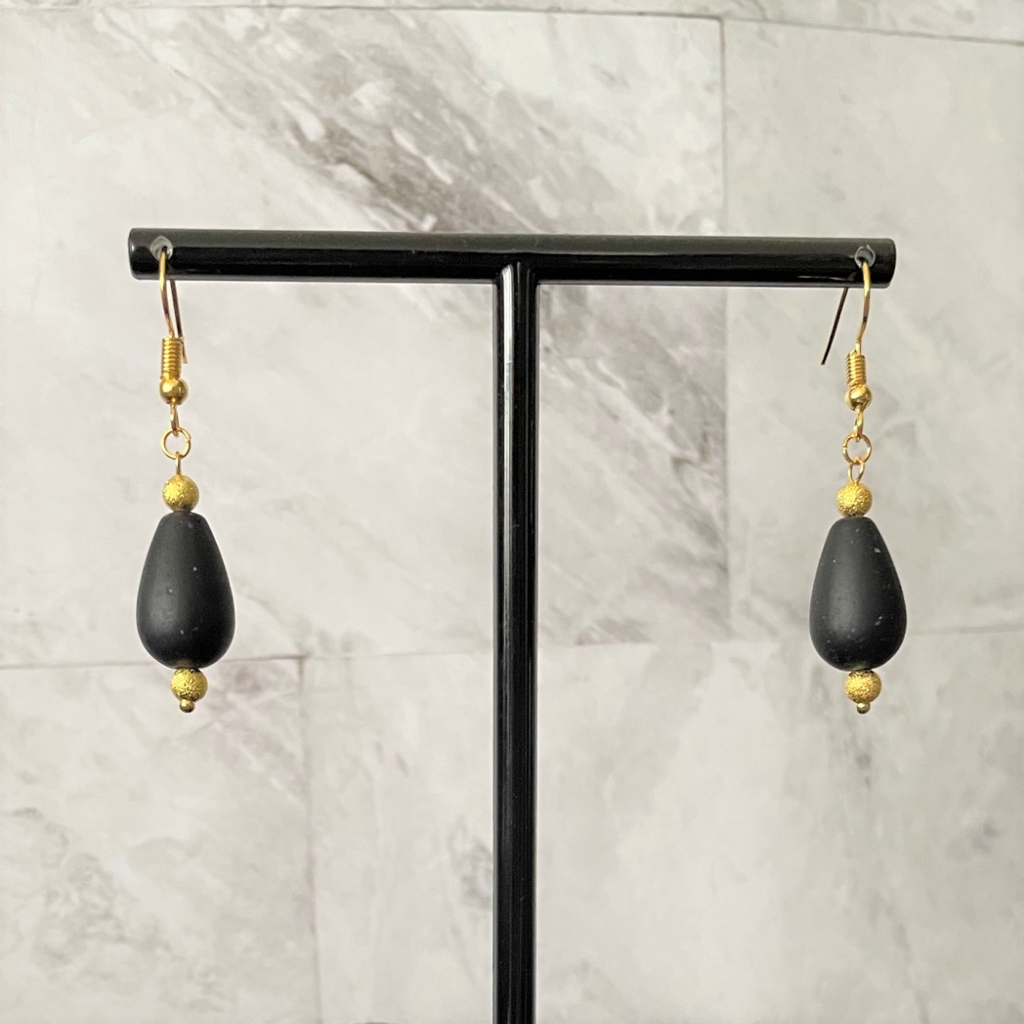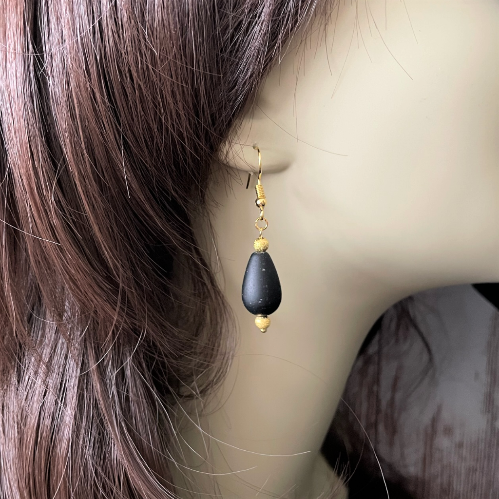 Jet Black Glass and Gold Teardrop Dangle Earrings