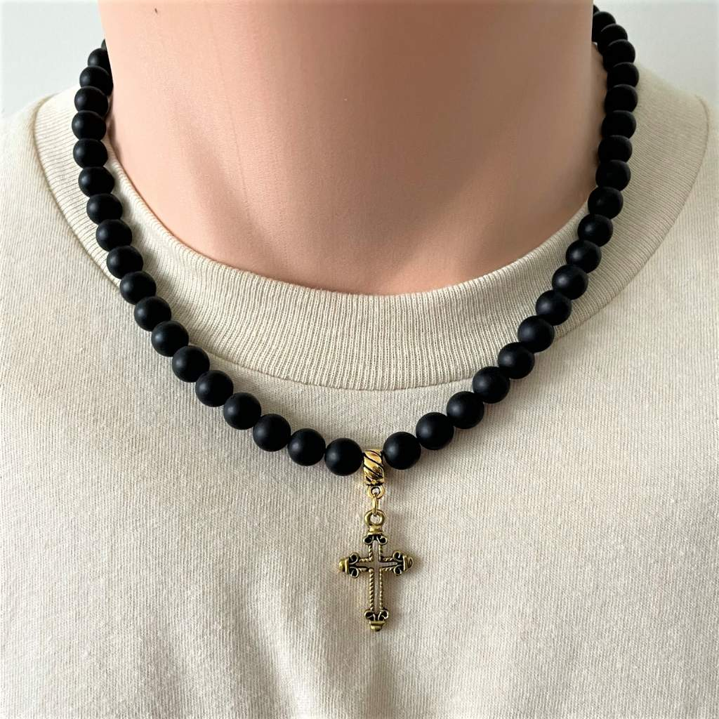 Matte Black Onyx Mens Beaded Necklace with Gold Cross With Jesus