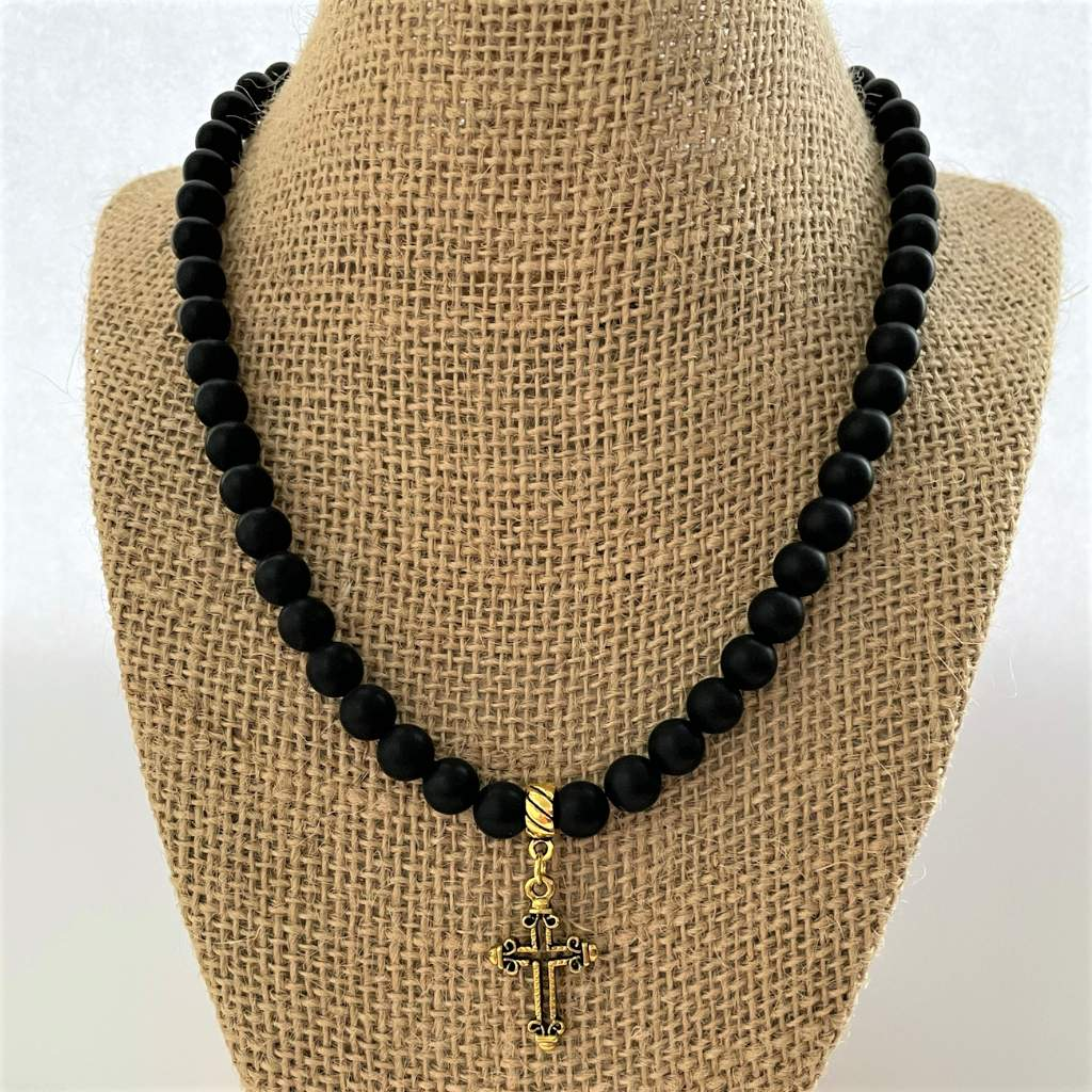 The necklace features 8mm matte Black Onyx beads accented by a 1" gold Cross with Jesus hanging from a gold bail. It secures comfortably with a gold stainless steel lobster clasp.