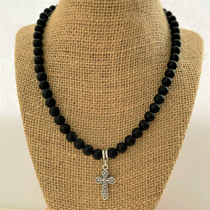 This men's necklace features 8mm matte Black Onyx beads paired with a 1" silver Cross pendant on a silver bail. It fastens securely with a sterling silver lobster clasp, combining bold style with lasting quality.