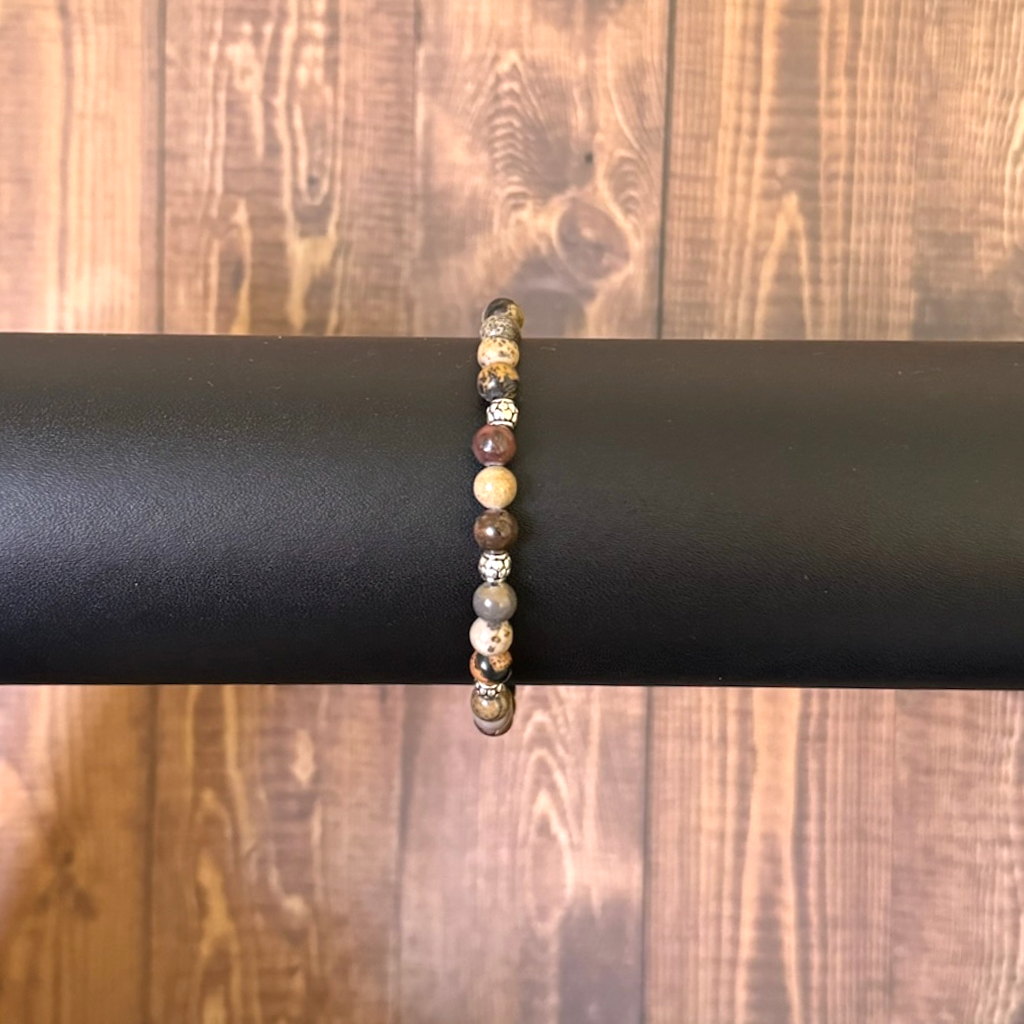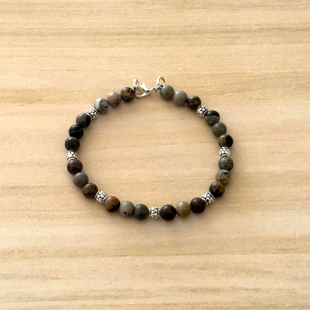 Made with 6mm Artistic Stones and silver beads, this mens bracelet is sure to stand out!