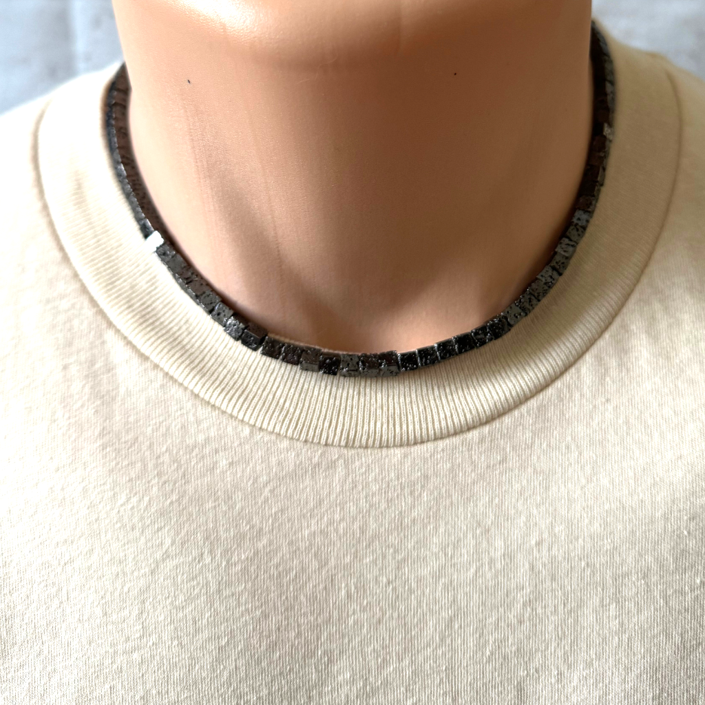This striking Black Lava Cube necklace is an essential accessory for every man’s wardrobe. Featuring 4mm cube beads, the necklace measures 16" in length and is secured with a durable stainless steel lobster clasp. Perfect for adding a modern, stylish touch to any outfit.