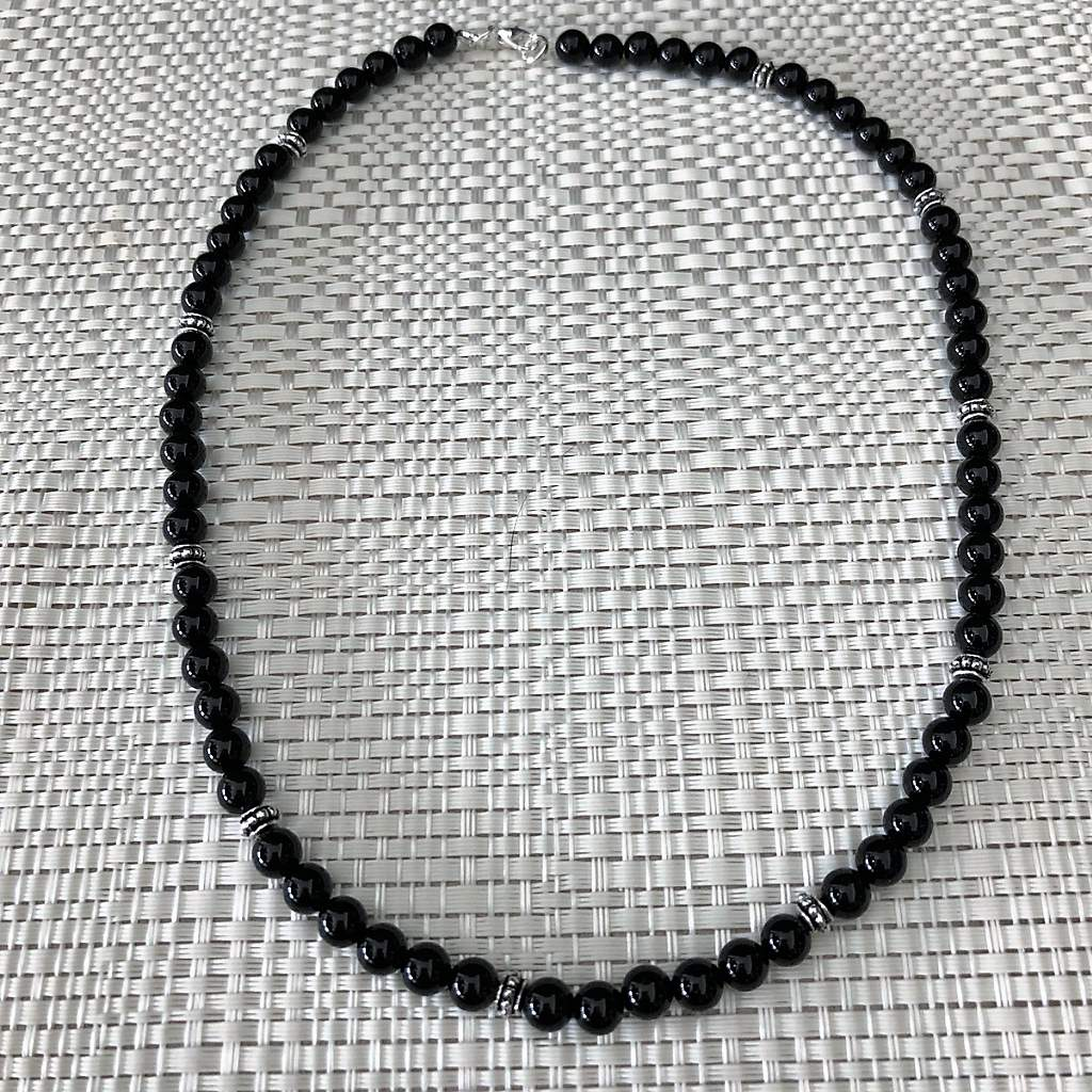 Featuring polished 6mm Black Onyx beads highlighted by intricately designed silver spacer beads, this necklace secures with a durable sterling silver lobster clasp for a refined and lasting finish.