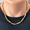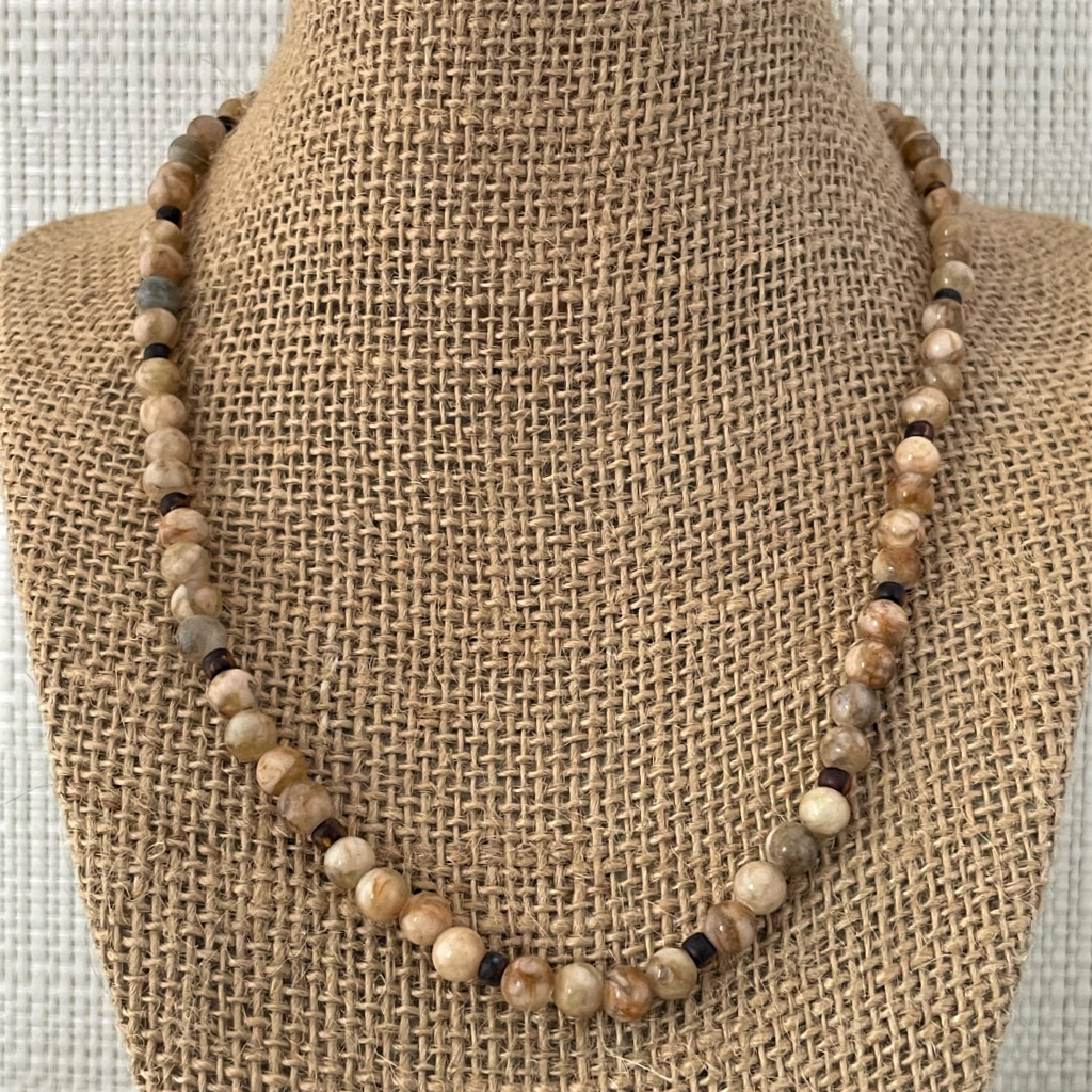 Beige and brown mixed Feldspath beads accented with frosted topaz Toho beads.