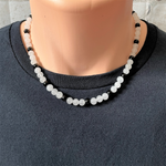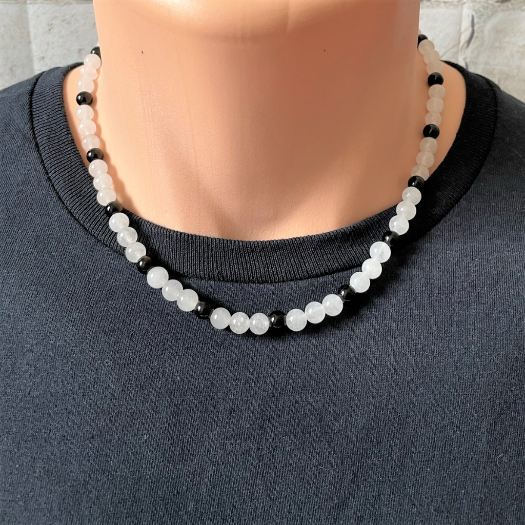 This stylish men's beaded necklace combines two beautiful semi-precious stones: White Jade and Black Onyx. It's the perfect accessory for any sophisticated wardrobe.