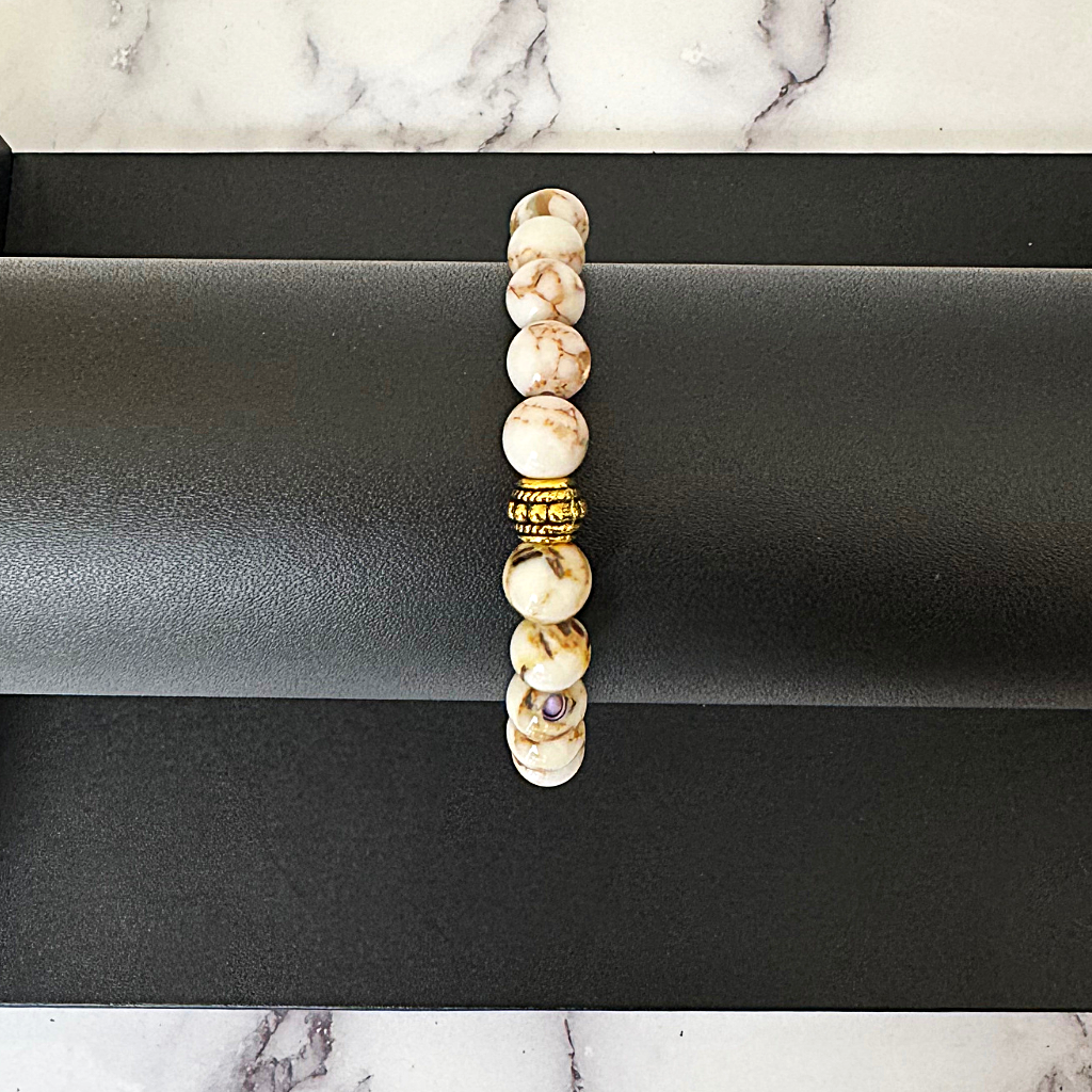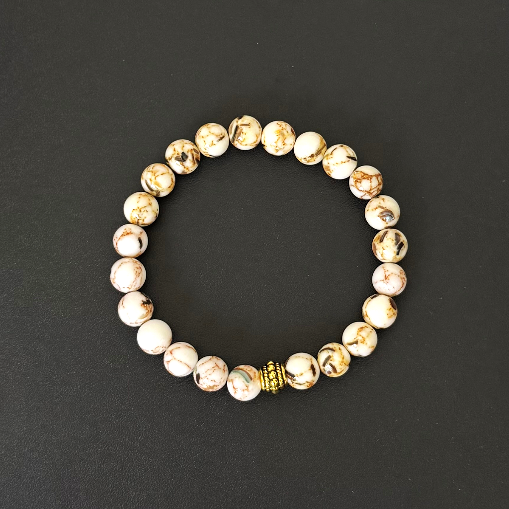 Featuring glossy white Howlite Mosaic Shell beads with natural brown streaks, each 8mm in size. This stretch bracelet is enhanced by a central gold metal accent bead, offering both style and comfort.