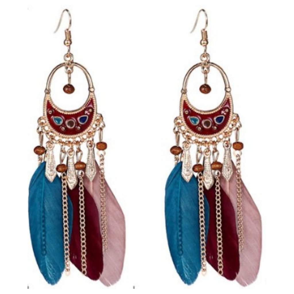 Multi Colored Feather and Gold Boho Dangle Earrings