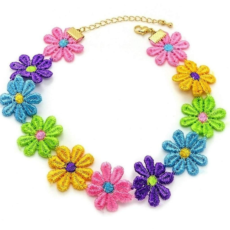 Add a pop of fun to any look with this colorful flower choker! Featuring cheerful yellow, green, purple, blue, and orange blossoms, each about 1" wide. The choker itself is 12" long with an extension for the perfect playful fit.