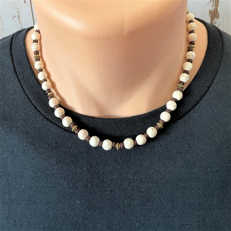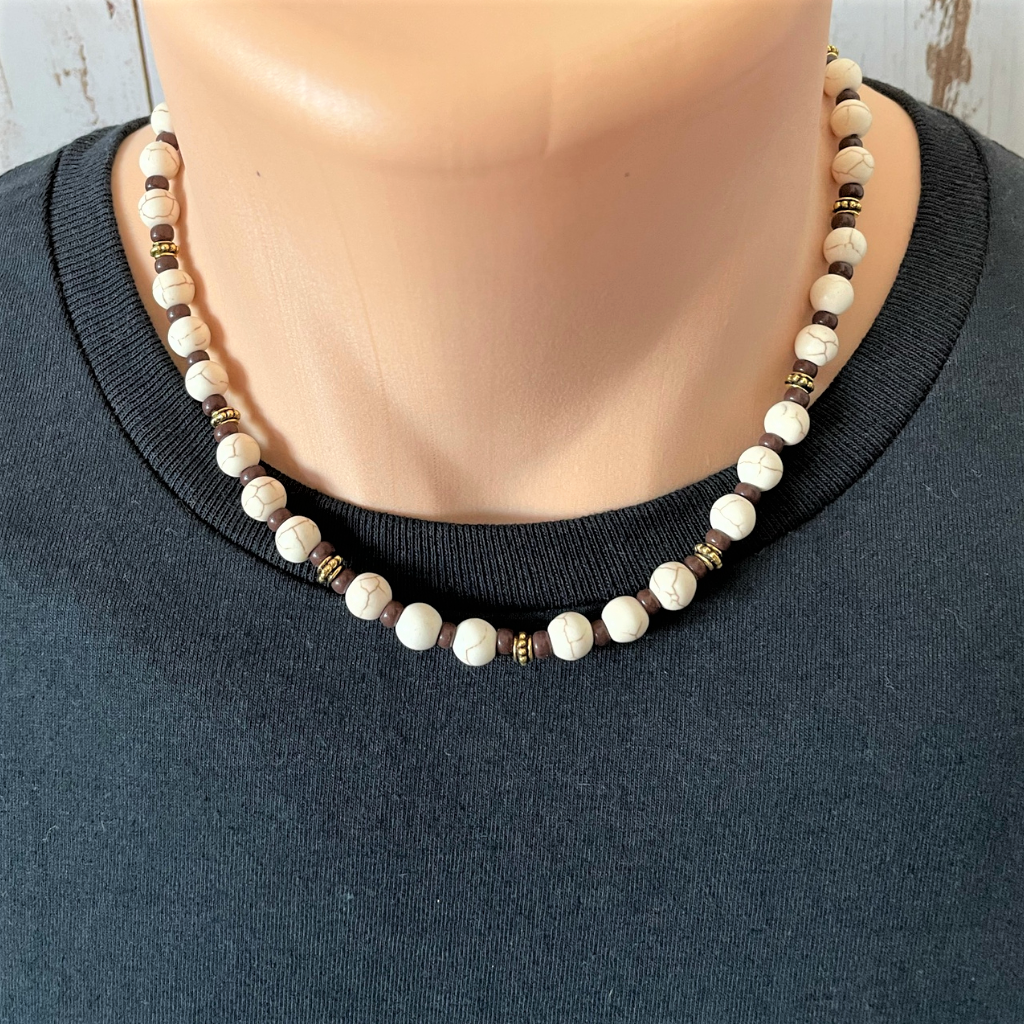This men's necklace features off-white Agate beads streaked with brown, complemented by rich brown Toho beads and elegant gold textured accents. Each agate bead measures 8mm, and the necklace is secured with a durable gold stainless steel lobster clasp. Elevate your style with this striking blend of natural tones and refined details.
