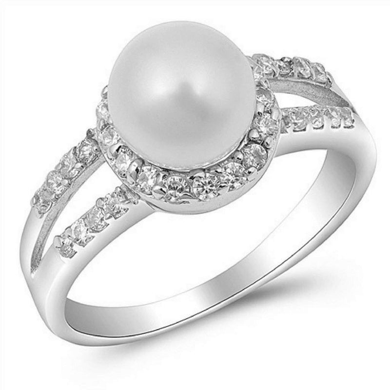Featuring Cubic Zirconia stones encircling a single creamy white Pearl, this ring showcases CZ accents extending along the Sterling Silver double band. Its elegant design brings together sparkle and sophistication for a striking statement piece.