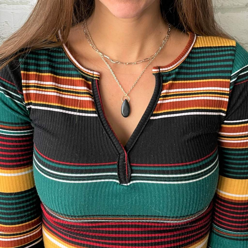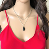 Picasso Marble features a black stone accented with white veins. The teardrop-shaped stone is 1" in length. This necklace includes two silver chains, 16" and 18" long, with an extension. The shorter chain has large links, adding a distinctive layered effect.