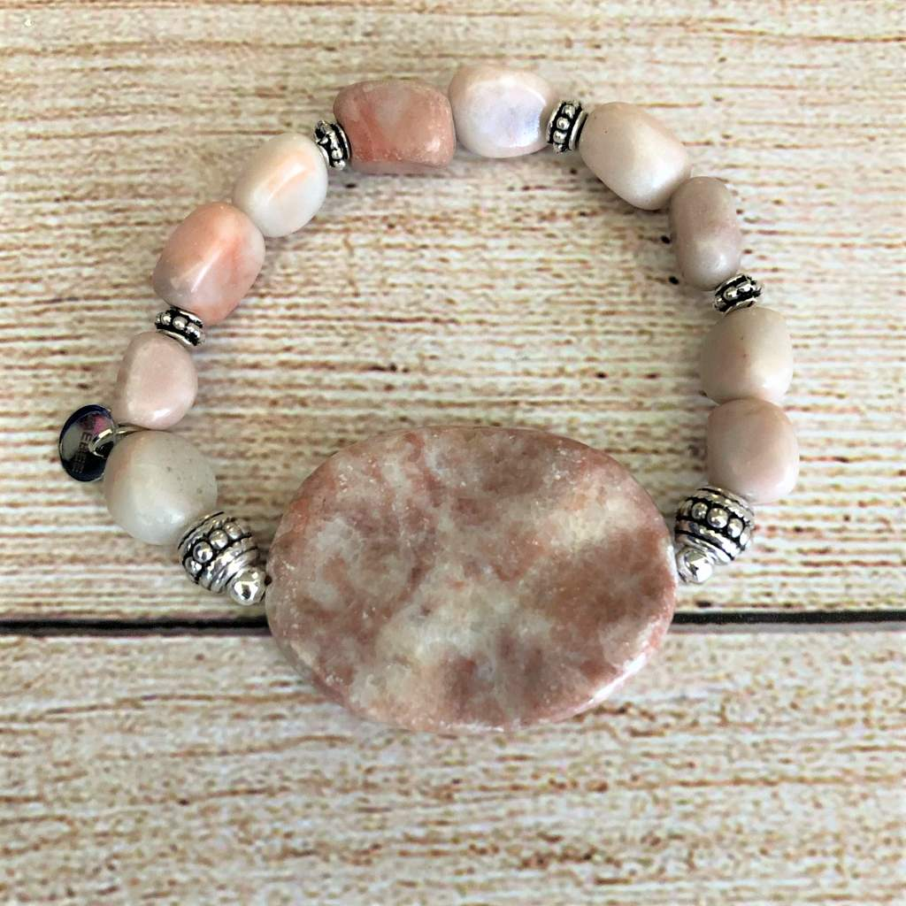 This stretch bracelet features a prominent, wavy oval pink Marble stone measuring 1 1/2" alongside Pink Feldspar nuggets, highlighted by textured silver bead accents.