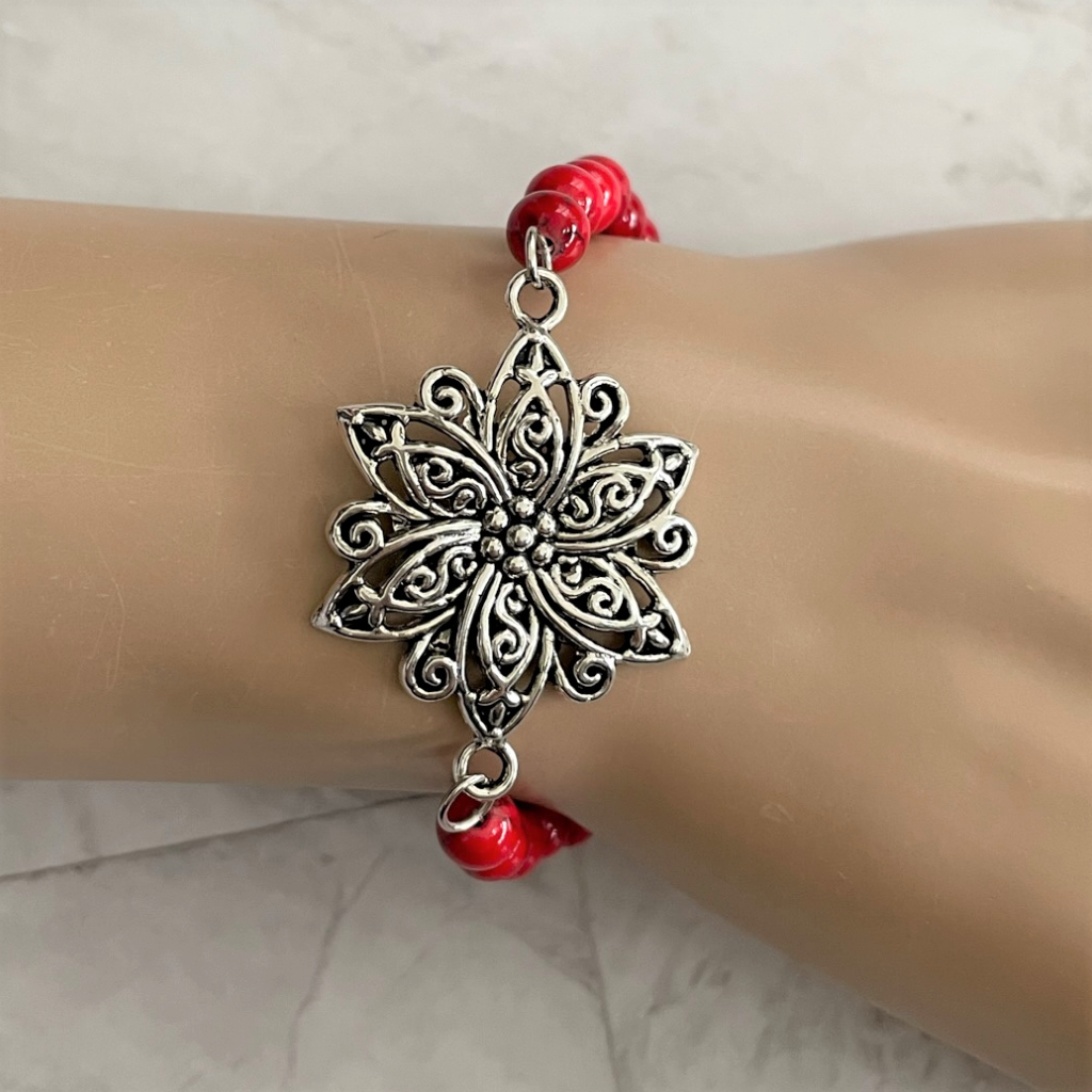 Red Mosiac Howlite Beaded Bracelet with Silver Flower