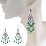 Silver chandelier metal earrings with a small flower on the top of the silver earring and a larger flower in the center of the chandelier earring.