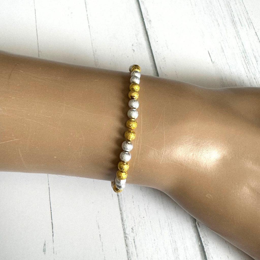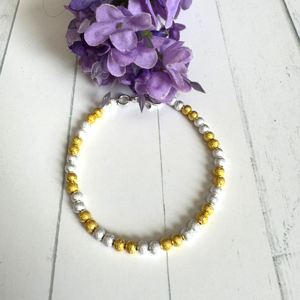 Dazzle and shine with our Silver and Gold Stardust Beaded Bracelet. Made with delicate 4mm beads, this bracelet will add a touch of elegance to any outfit. The combination of silver and gold makes it a must-have accessory for any occasion.