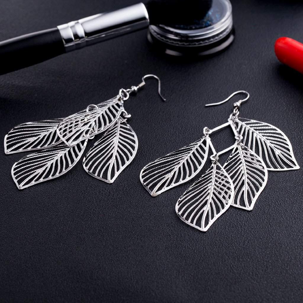 These charming earrings feature four delicate silver leaves, each measuring 1 3/4" by 1", swinging freely on a 3 1/2" long dangle. Light as a breeze, they add a whimsical touch to any outfit.