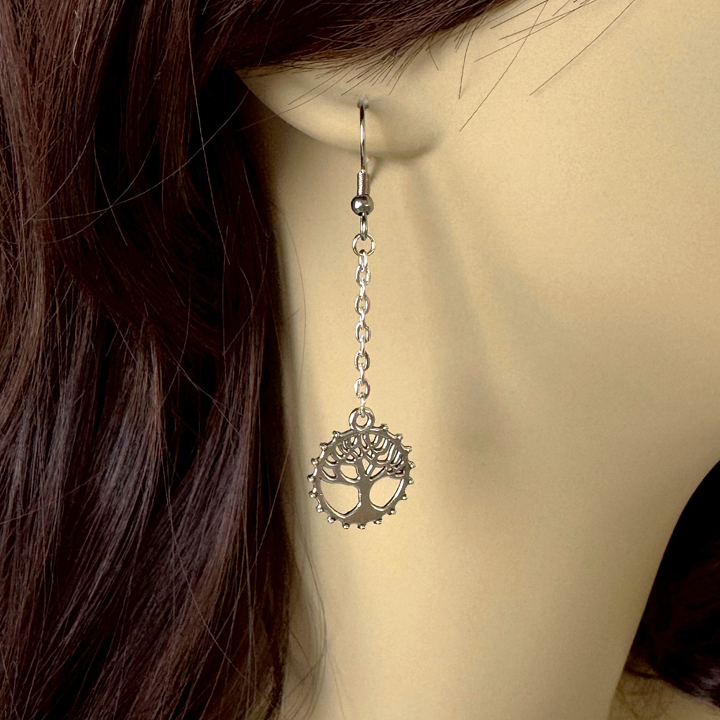 Celebrate nature and meaningful symbolism with these elegant Silver Tree of Life Dangle Earrings. Each earring features a beautifully detailed, round Tree of Life charm (approx. 3/4") that gently sways from a delicate silver chain. The full earring length measures approximately 2 1/2", finished with a Sterling Silver earwire for comfortable, secure wear.