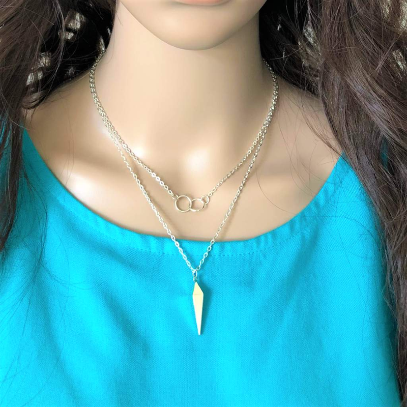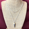 This elegant silver necklace features two layered chains, one adorned with a sleek silver spike. The shorter chain is detailed with double silver rings. The necklace measures 15" and 18" in length, with an additional extension for a customizable fit.