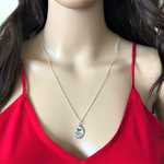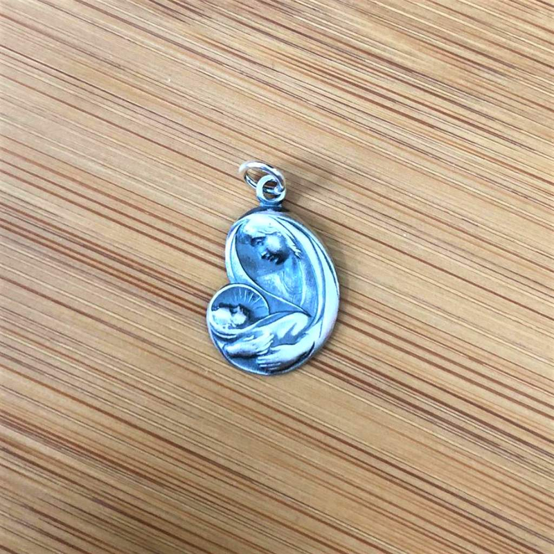 This sterling silver necklace features a charm of the Virgin Mary holding Baby Jesus. The religious pendant measures 16mm by 14mm (3/4") and hangs from a sterling silver chain, offering a meaningful and elegant symbol of faith.