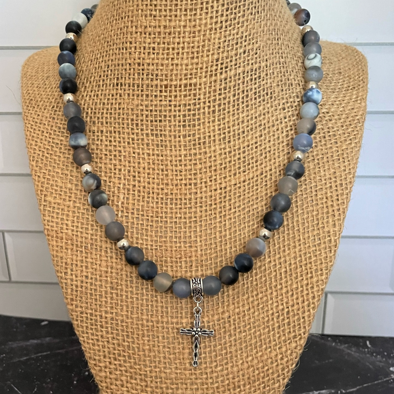Mottled blue matte Agate beads accented with silver beads with a silver Cross charm.