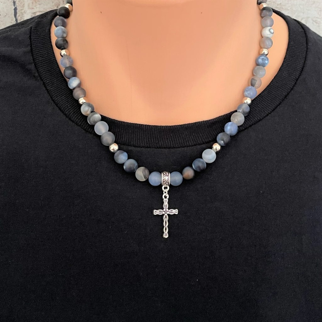 Storm Line Matte Agate and Silver Cross Mens Necklace