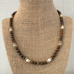 This striking necklace combines the earthy elegance of deep brown Tigers Iron beads with luminous white Mosaic shell and pearl accents featuring natural brown undertones. Delicate gold-toned ring beads provide sophisticated detailing throughout the design. Each bead measures 6mm for a refined, balanced look that works with any style. Secured with a durable gold stainless steel lobster clasp, this piece offers both beauty and lasting quality for everyday wear or special occasions.
