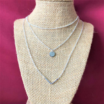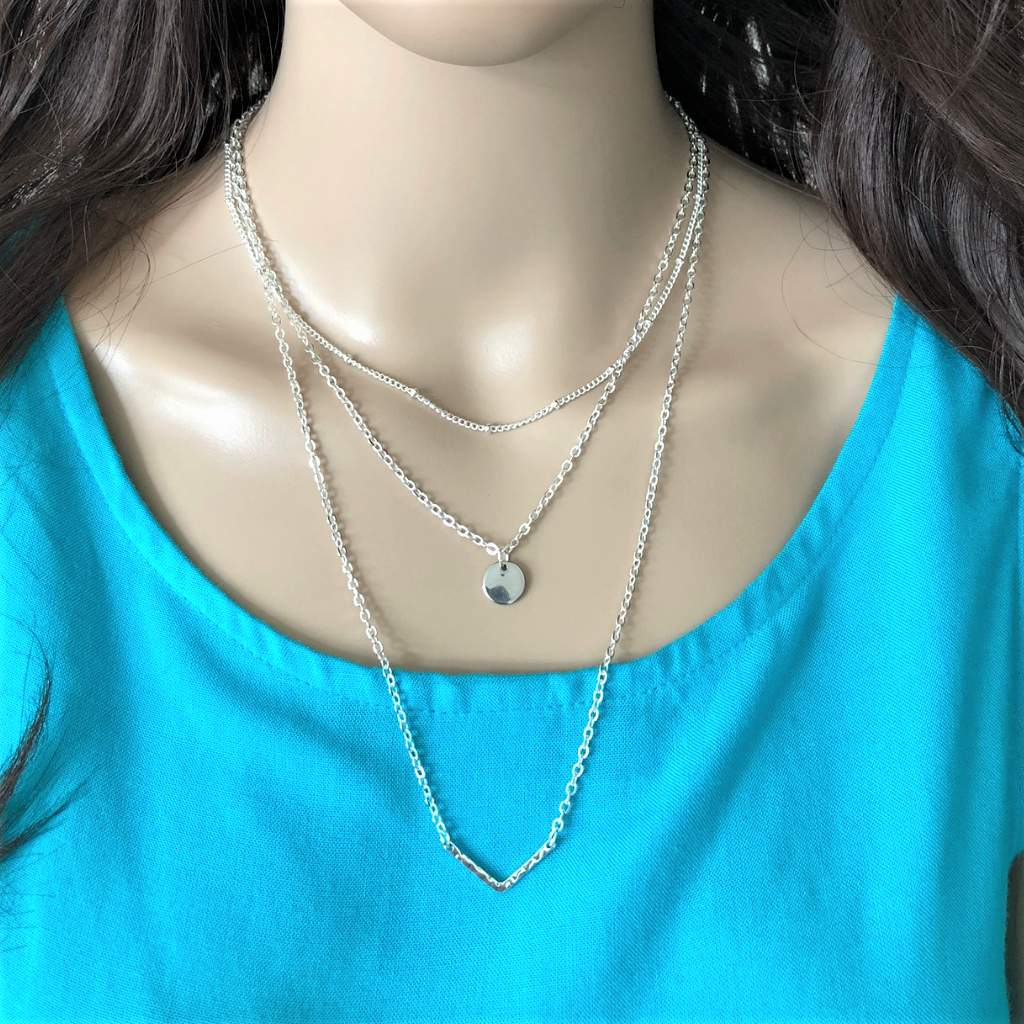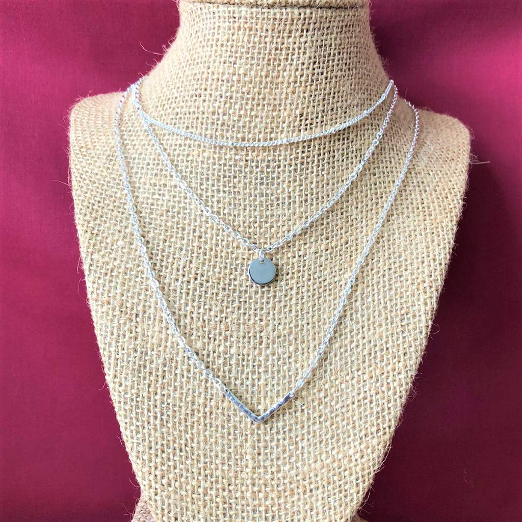 This necklace features three silver chains, each adorned with a silver disc and a V-shaped charm. The shortest chain is decorated with silver beads for an extra sparkle. It comes in three lengths: 16", 18", and 22", perfect for layering with your favorite outfits.