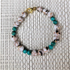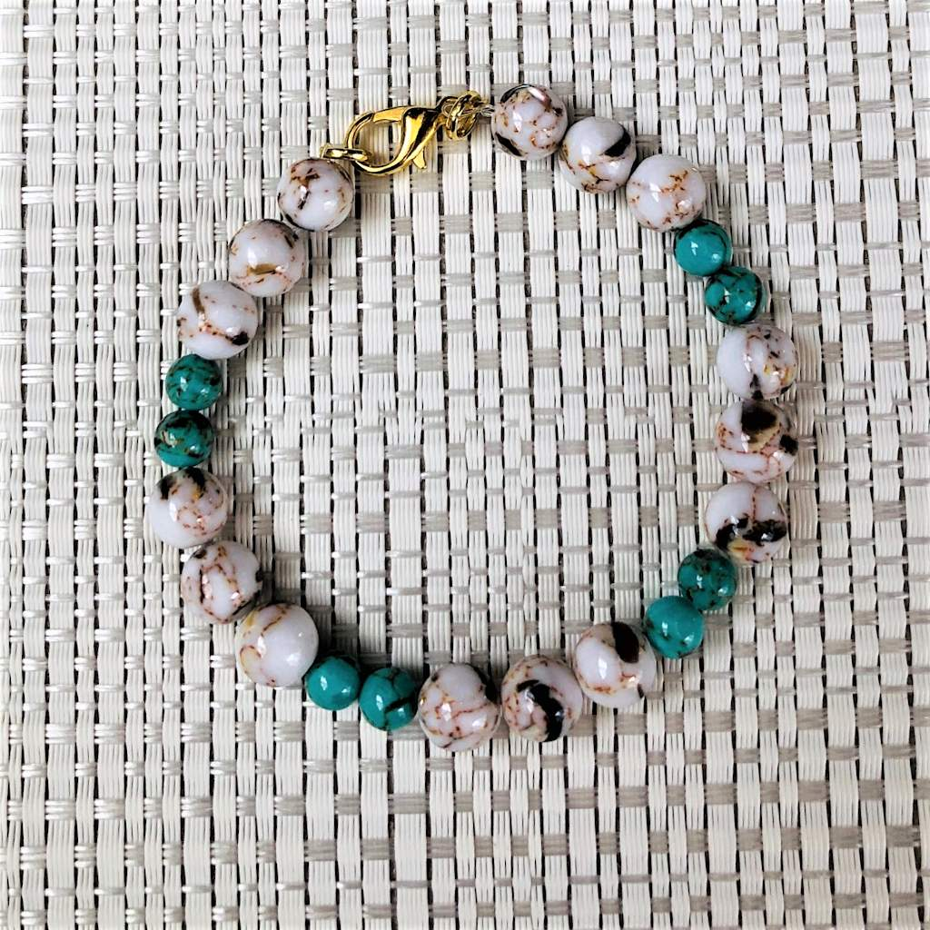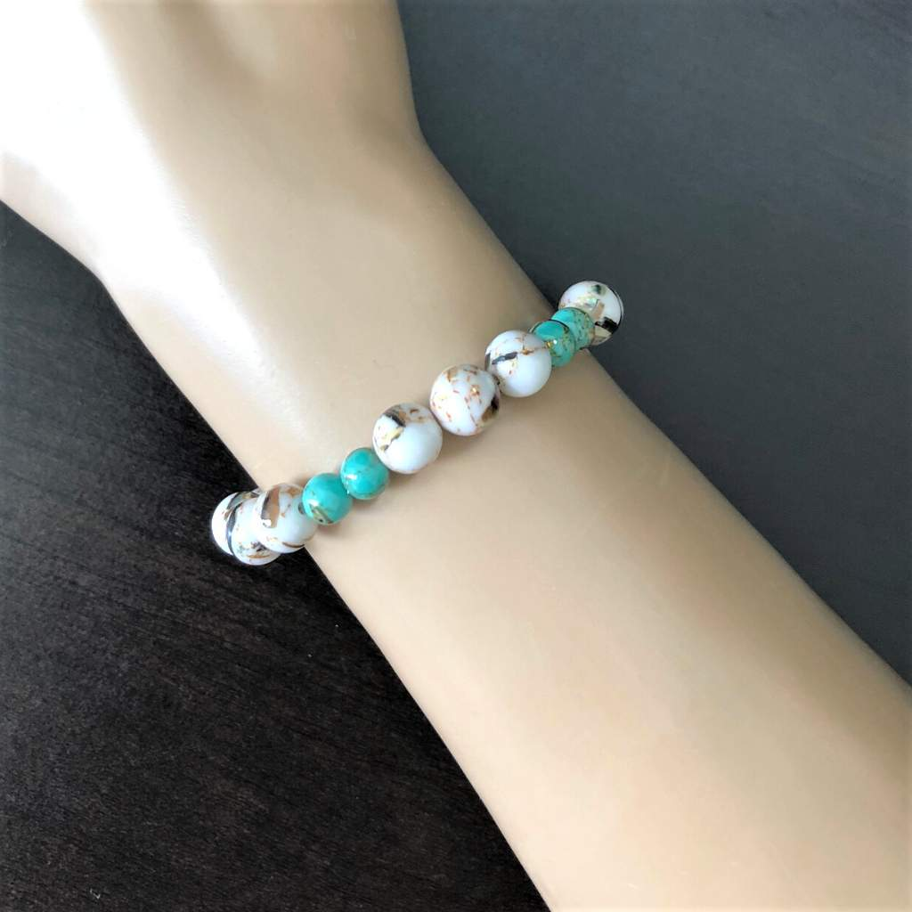 This delightful bracelet blends vibrant Howlite mosaic beads with charming natural shells. Featuring both crisp white 8mm beads and cool sea green 6mm beads, paired with rich brown shells for a truly standout look. Finished off with a handy lobster clasp for easy wear.
