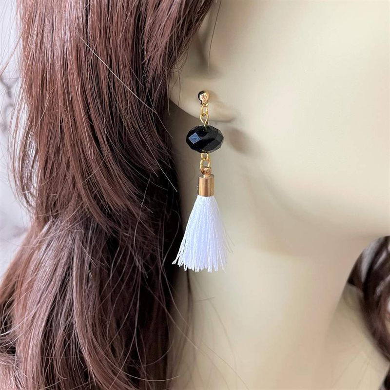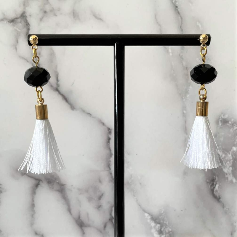 A white tassel set in gold on a black oval black crystal measures 2 3/4".
